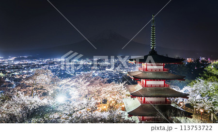 新倉山浅間公園の夜景 ライトアップされた桜と忠霊塔 富士山のシルエット【山梨県・富士吉田市】