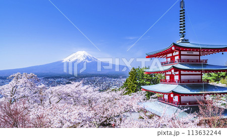 春の新倉山浅間公園 富士山、五重塔、満開の桜【山梨県・富士吉田市】