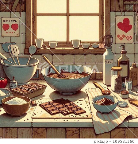 バレンタインチョコレートを作っているキッチンの様子のイラスト 80年代〜90年代アニメ風 レトロ