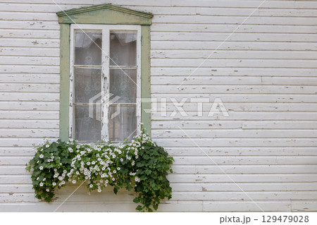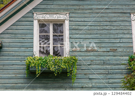 Vintage light green turquoise wooden house with decorative white window and flower box