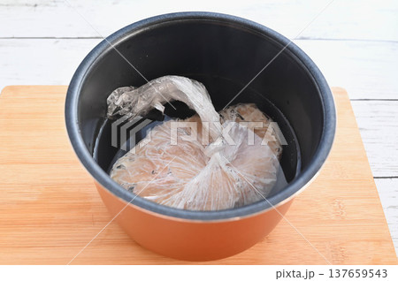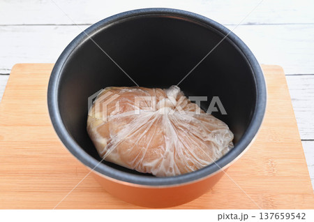 炊飯器に入れた塩こうじに漬けた鳥胸肉