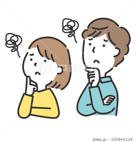 斜め上を見上げて悩んでいる若い夫婦のイラスト