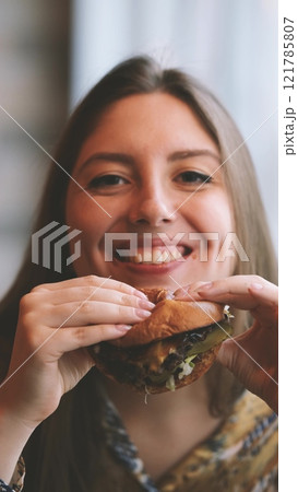 Close-up portrait of a woman in a fast food cafe eating a hamburger. Hungry woman eating a burger.
