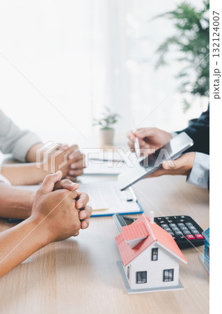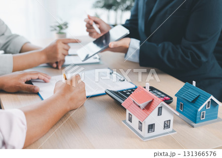 Real estate broker agent presenting and consult to customer to decision making sign insurance form agreement, home model, concerning mortgage loan offer in office