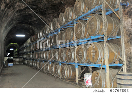 宮崎県西臼杵郡高千穂町にあるトンネルの駅敷地内のトンネル貯蔵庫で焼酎の原酒が熟成されている風景