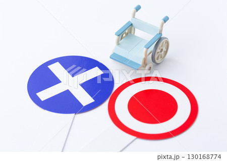 丸バツのプレートを持って悩むミドル女性の介護福祉士