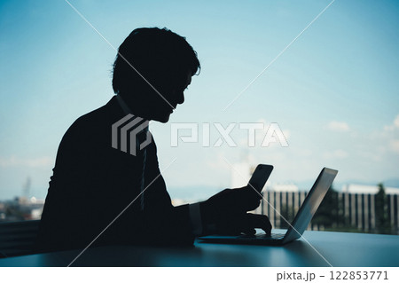 スマホを操作する男性のシルエット(特殊詐欺・誹謗中傷)