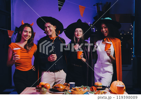Joyful office Halloween party with coworkers in costumes, celebrating with drinks and laughter, fostering teamwork and festive spirit
