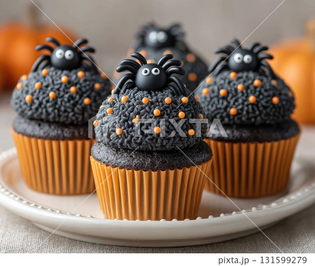 Halloween spider cupcakes with black frosting and orange sprinkles
