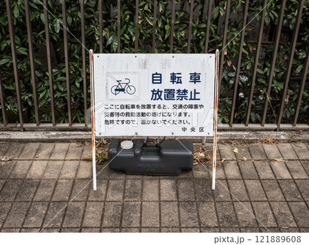 歩道に設置された「自転車放置禁止」の看板(東京都中央区)