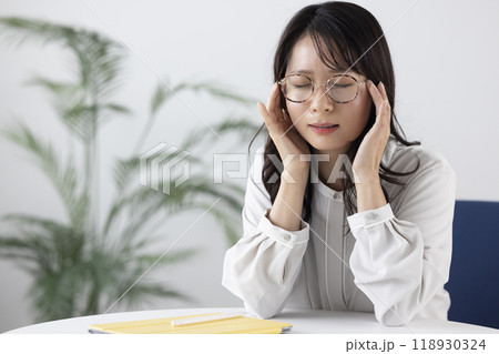 職場のデスクで辛そうな表情をしている女性
