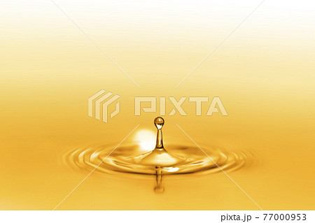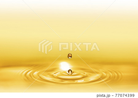 ヘルシーなエクストラバージンオイルの金箔に輝く水滴と波紋の背景。
