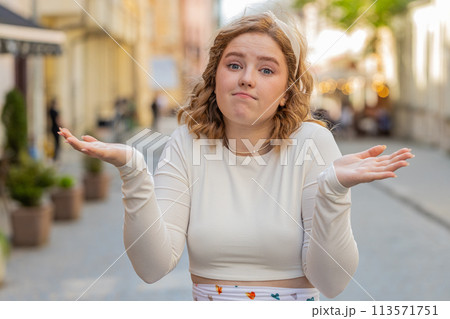 Confused woman feeling embarrassed about ambiguous question having doubts no idea in city street