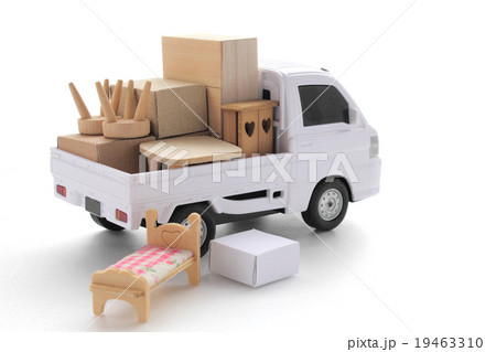 オート三輪のおもちゃなどのミニチュア模型を使って引っ越し等のイメージ撮影(白背景)