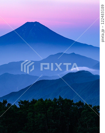 (山梨県)雁ヶ腹摺山より望む夜明けの富士山と山並みの絶景