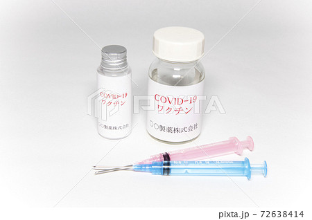 新型コロナウイルスのワクチンと注射器のイラスト。ワクチン接種のイメージ。