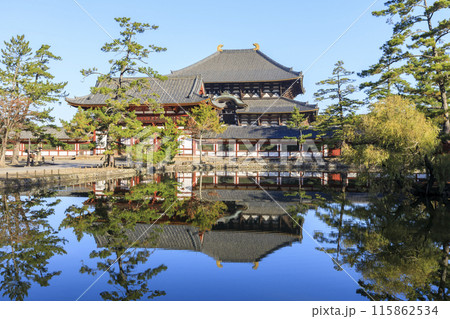 奈良県奈良市 秋の東大寺 鏡池に映る中門と大仏殿