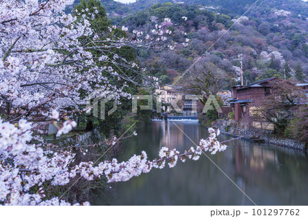 日本の川の風景:春の京都大堰(保津)川と嵐山通船貸しボート発着場の風景