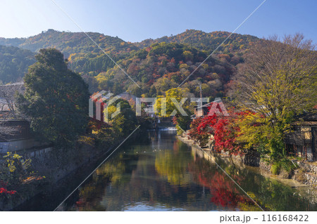 紅葉の時期の京都嵐山の大堰川分流の中ノ島橋からの風景