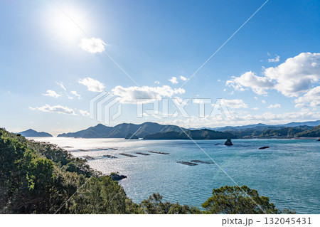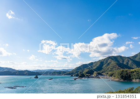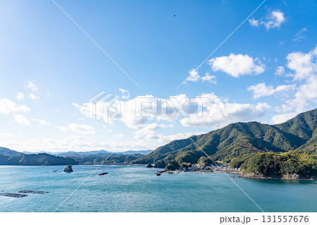 三重県南伊勢町 南島大橋の見える中ノ磯展望台からの秋の贄湾と慥柄の漁村の眺め