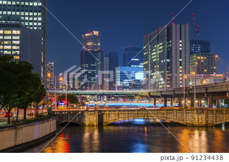 夕暮れの大阪中之島 大江橋から見る高層ビルと阪神高速