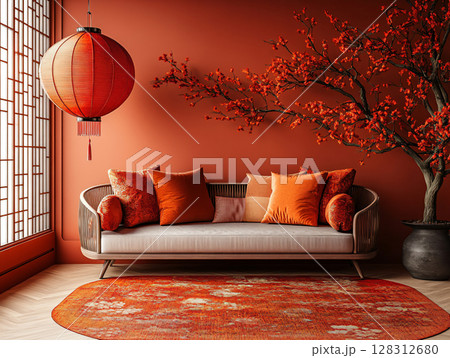 Interior of modern living room. traditional Chinese decorations concept. Chinese New Year celebration. AI Generated.