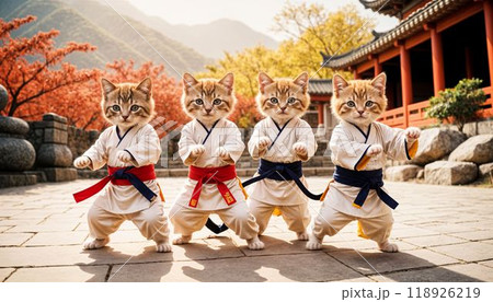 4 cute kittens in a keikogi kimono in a fighting stance are engaged in karate aikido wushu kungfu in the courtyard of a Chinese temple. High quality illustration