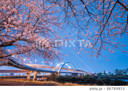 夜景「東京都」五色桜大橋と江北JCTの春の風景
