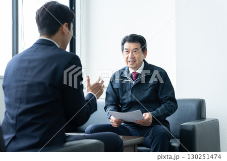 打ち合わせするスーツと作業着の男性