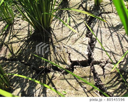 夏の土用に水を切る田んぼ中干しの土のヒビ割れ(縦)
