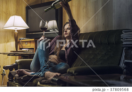 Woman sitting in a bathroom, with her panties down, holding a bottle of whiskey