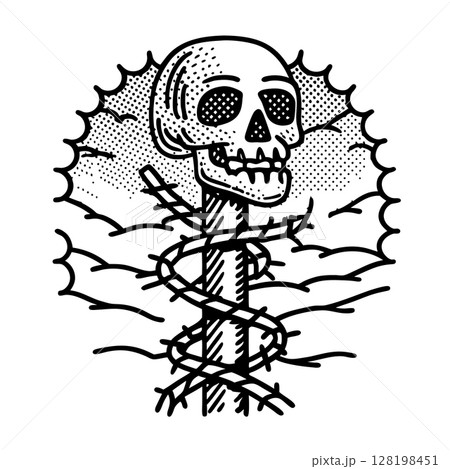 Skull on pole wrapped with barbed wire, ominous atmosphere, clouds, rising sun, danger, grim warning sign, AI Generative