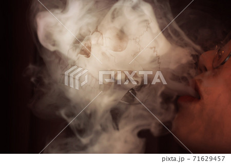 closeup woman smoking release smoke overlay with skull for death with lung cancer disease concept.