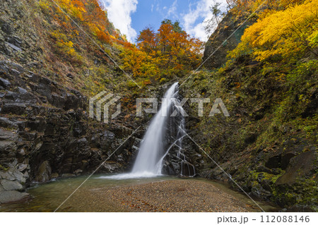 日本 青森県中津軽郡にある世界遺産、白神山地の暗門滝の第2の滝と紅葉