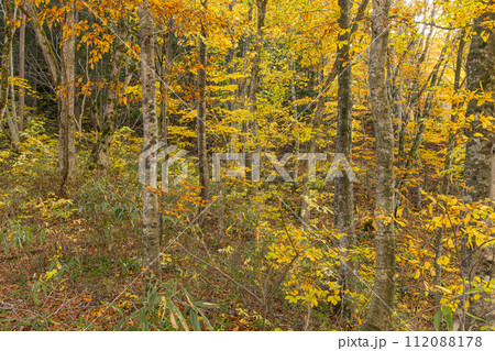 日本 青森県中津軽郡の白神山地にある世界遺産の径、ブナ林散策道の風景と紅葉