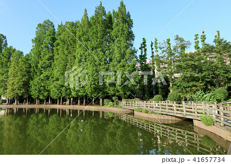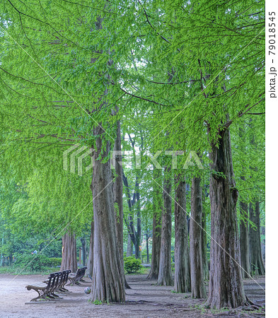 若葉生い茂るメタセコイアと木漏れ日