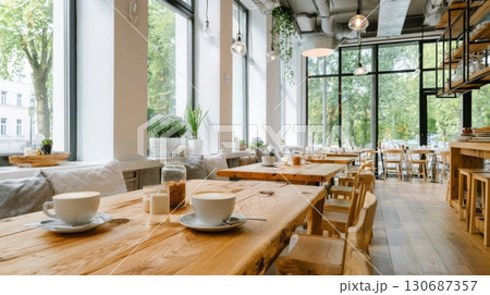 コーヒーカップとおしゃれなカフェ店内