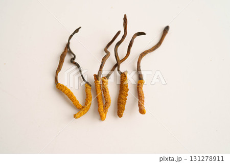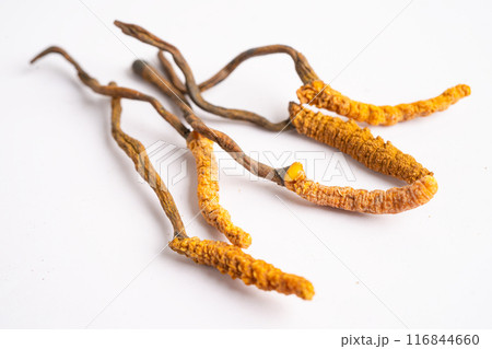 Cordyceps sinensis or Ophiocordyceps sinensis isolated on white background, mushroom herb treatment medicine.