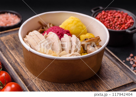 Asian dish with sliced chicken fillet, buckwheat noodles, soy sauce