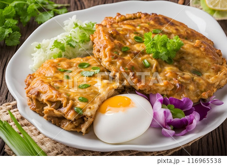 Egg Foo Young is a Chinese-style omelet made with eggs mixed with ingredients like pork, shrimp, bean sprouts, chives, onions and other seasonings, stir-fried until aromatic. AI Generated