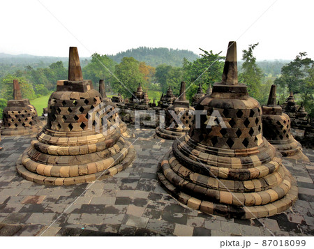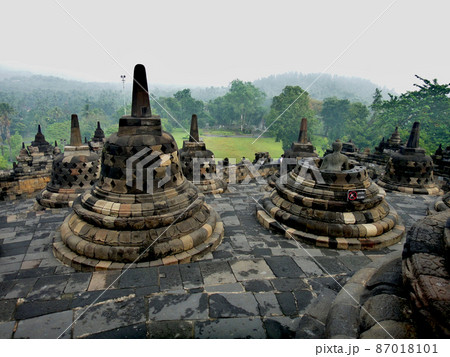 ジャワ中部のボロブドゥール仏教遺跡の回廊 仏塔)