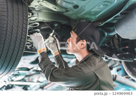自動車の下回りを点検ハンマーを使いチェックする自動車整備士の男性