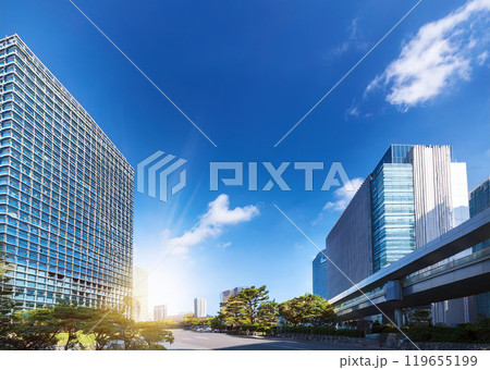 Downtown corporate business district architecture. Glass reflective office buildings against blue sky and sun light. Economy, finances, business activity concept. Rising sun on the horizon.