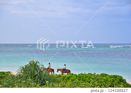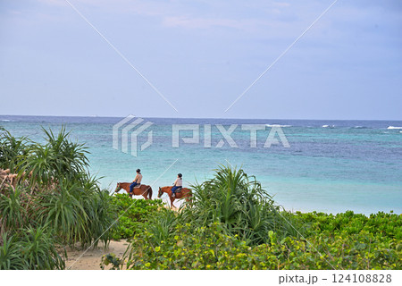 《沖縄県》読谷村の青い空と海 浜辺で乗馬