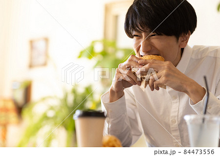部屋でハンバーガーを食べる若い男性