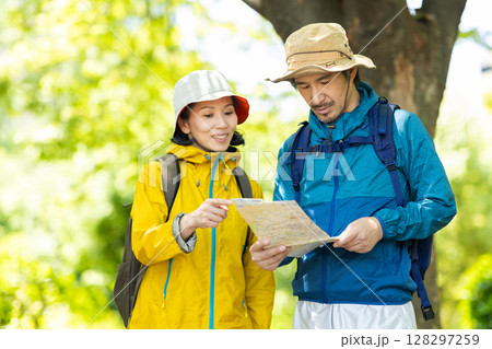 ハイキングをするミドル夫婦
