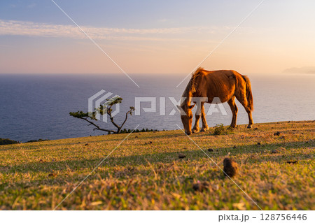 (宮崎県串間市)都井岬 夕暮れの斜面で草を食む野生馬