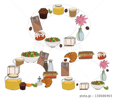 cafe food drinks Frame template Oval set rectangle Cafe hand drawn illustration. Vector graphic line ink art. For poster, invitation, backdrop, ad, sale promotion, print for t-shirt