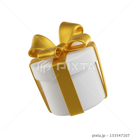 3D White Gift Round Box with a Gold Ribbon and Bow. A stylized icon perfect for Holiday, Birthday, Weddings or Christmas. Ideal for greeting cards and promotional materials. 3D rendering