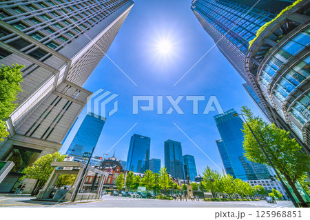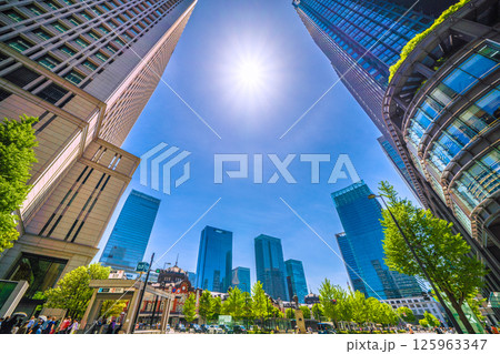 日本の東京都市景観 東京駅丸の内北口・東京駅赤レンガ駅舎やハロ、八重洲などのビル群を望む